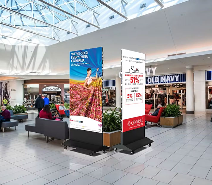 Product Features:Poster LED displays are slim, vertical LED screens designed to fit seamlessly in storefronts, mall corridors, office lobbies, exhibition booths, and pop-up shops. They combine high-resolution imagery with vibrant color reproduction to create attention-grabbing displays for advertising, promotions, or branded content.