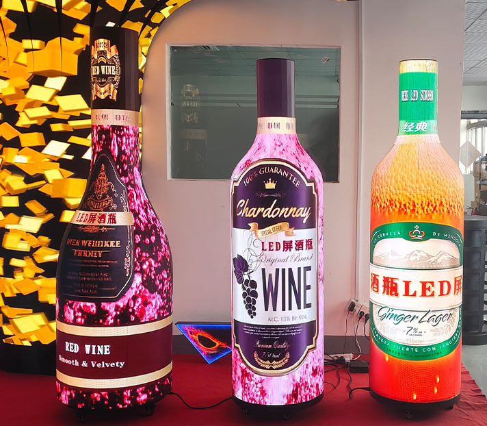Product Features:Bottle LED displays are creative, eye-catching LED screens shaped like bottles. Certain models come with a built-in refrigerator, keeping drinks cold, ideal for luxury bars, product launches, and experiential marketing. The unique bottle shape draws attention, enhances ambiance, and creates a memorable visual experience for guests.