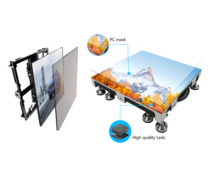 Product Features:Floor LED displays, also known as LED tile screens, are specially designed LED panels that can be installed on floors, stages, or platforms. They are built to withstand foot traffic, high loads, and frequent use while delivering bright, high-resolution visuals. With reinforced cabinets, anti-slip surfaces, and robust construction, these screens ensure safety, durability, and reliable performance for indoor or semi-outdoor applications.