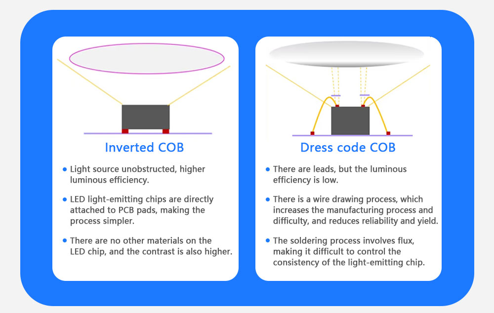 & 불;칩 온 보드 (COB) 아키텍처: LED 칩을 회로판에 직접 결합하여 전통적인 SMD 포장 단계를 제거합니다.