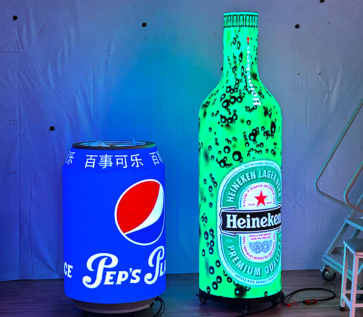 Our wine bottle and can-shaped LED screens blend creativity with technical excellence, delivering unforgettable brand experiences.