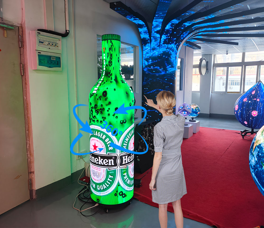 bottle-shaped displays for dynamic brand ads or product launches, attracting foot traffic and engagement. In hotel lobbies