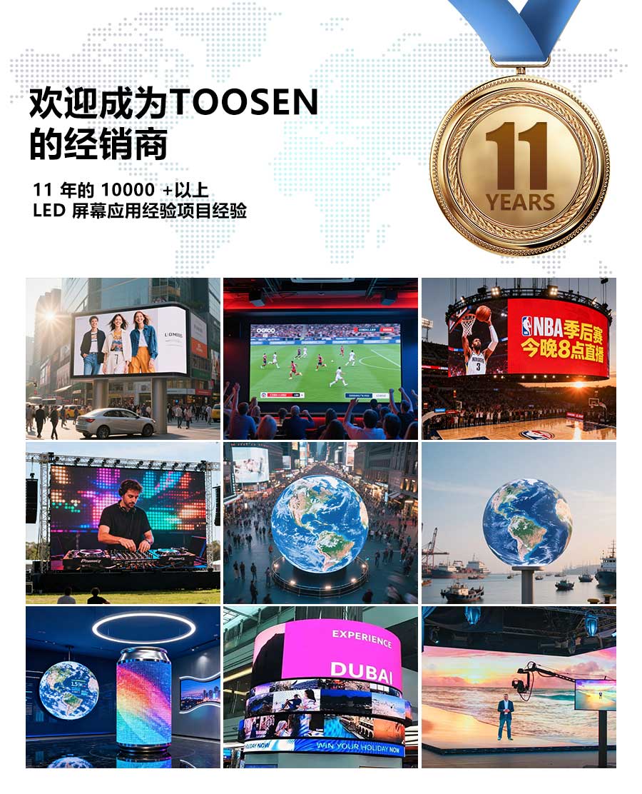 TOOSEN专注于定制LED屏幕。其专业的研发团队提供量身定制的解决方案,使用顶级材料和先进科技确保品质。从设计到售后的一站式无缝服务使其成为您的理想选择。