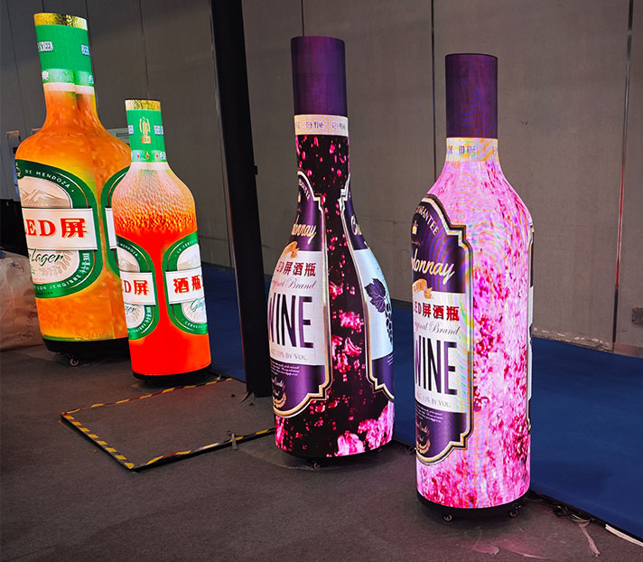 产品特点:瓶形LED显示屏是造型新颖、引人注目的瓶状LED屏幕。部分型号配备内置冰箱,可保持饮品冰爽,是高档酒吧、产品发布会和体验式营销的理想之选。独特的瓶形设计能够吸引眼球,提升氛围,并为宾客打造难忘的视觉体验。